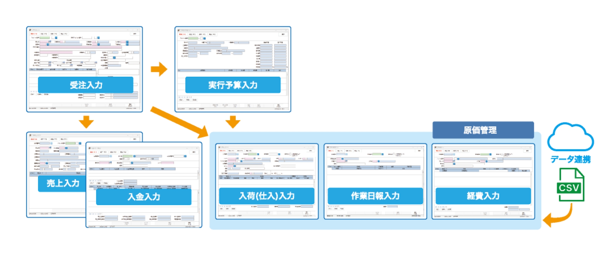 • 見積・受注から実行予算、各原価計上、売上、完了までプロジェクト 番号で管理します。