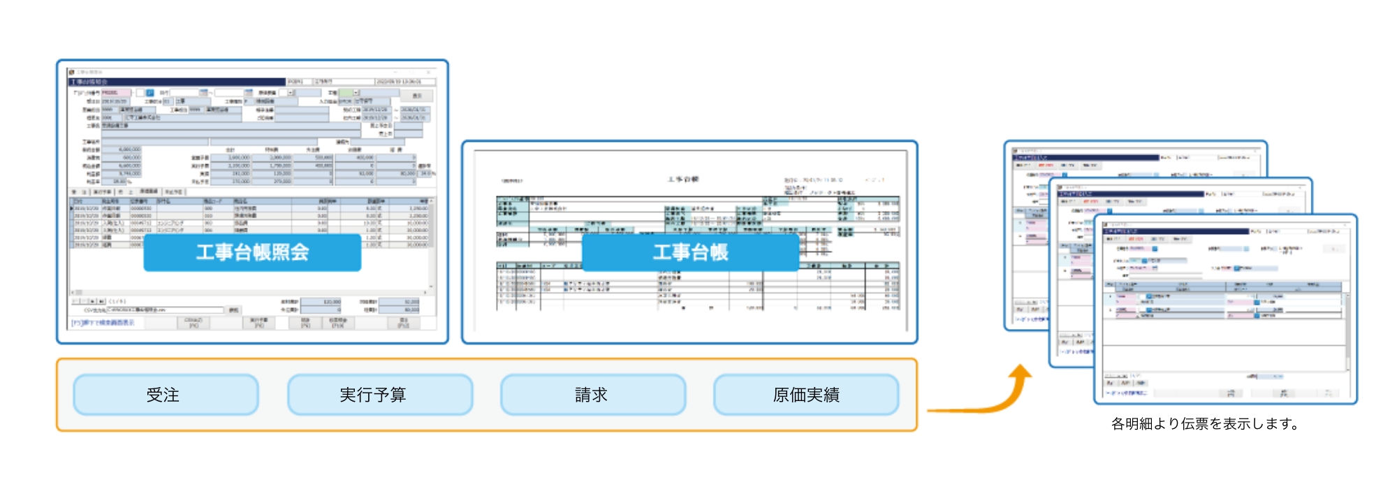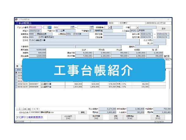 • 工事台帳照会から受注、実行予算、請求、原価実績の明細を確認することができます。
