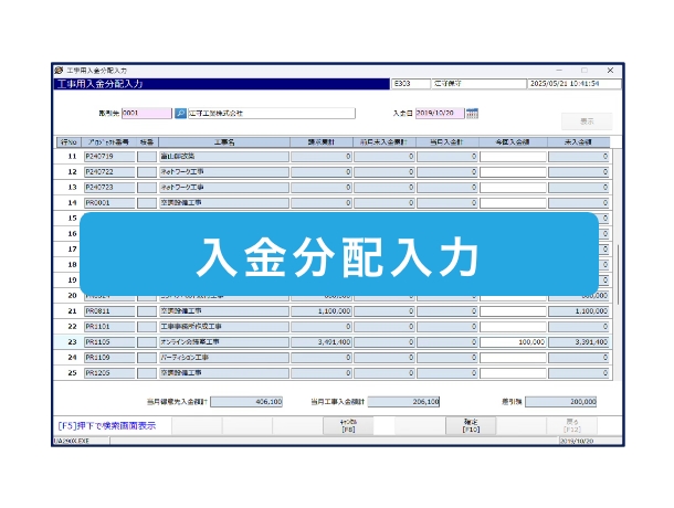 入金処理は債権先毎に登録、各案件には入金額を分配することで工事台帳に反映します。