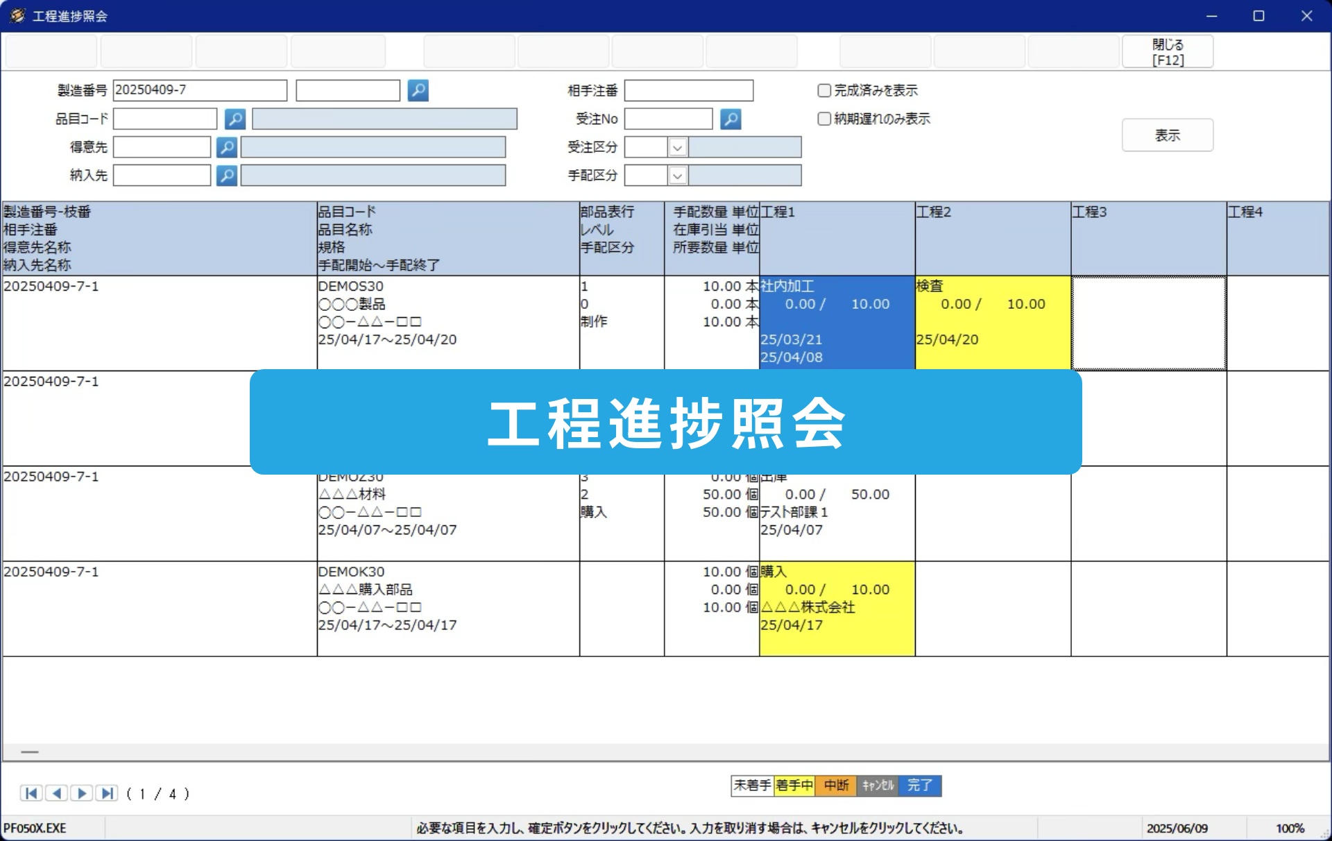 BOMに基づいた工程計画により手配を行い、生産実績の登録がおこなえます。工程進捗照会によりリアルタイムに 状況把握が可能です。