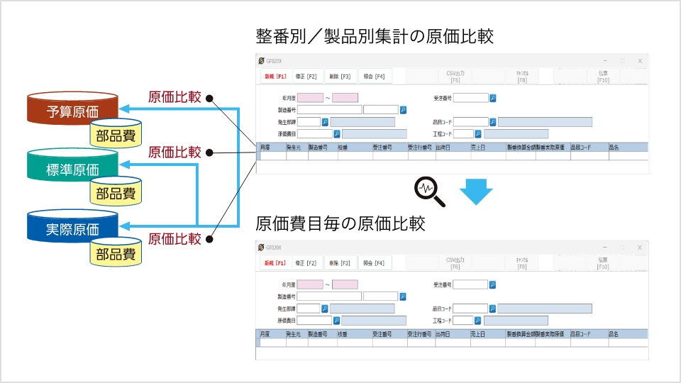 製造過程で発生した原価をリアルタイムに集積することにより、予算原価との差異の発見、原因追求を早期に行うことができます。
